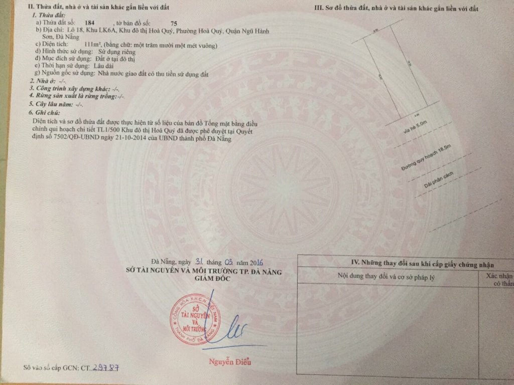 Lô 18, Khu 6A, Khu đô thị Hòa Quý, Q. Ngủ Hành Sơn, Tp Đà Nẵng, đất đẹp đường lớn 18.5m lề 5m